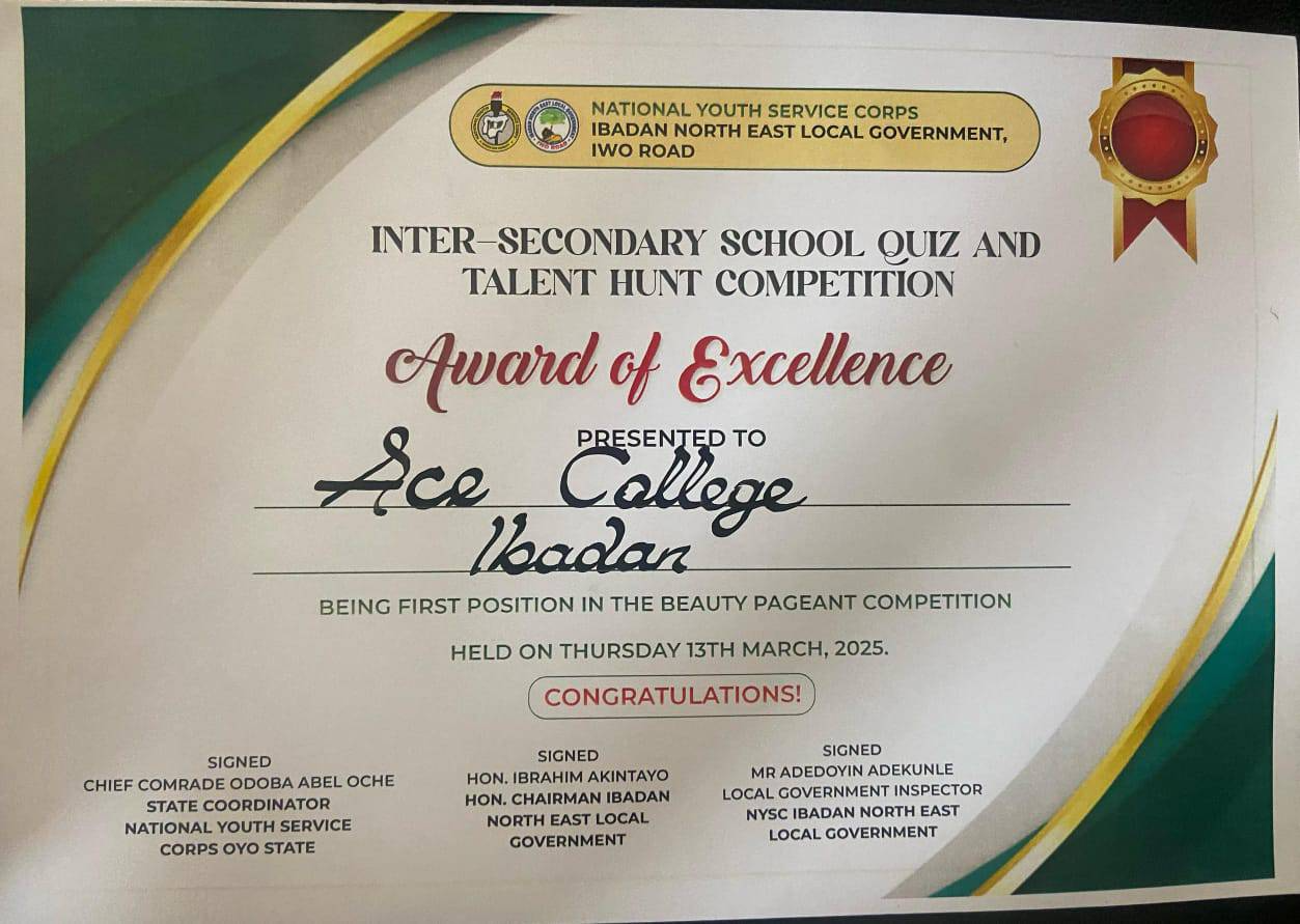 INTER SECONDARY SCHOOL BEAUTY PAGEANT (ACE COLLEGE 3ST POSITION).